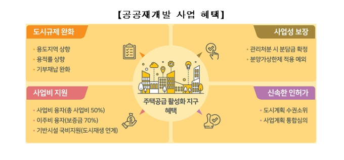 해당 사업구역에는 ▲용적률 상향(법적상한의 120% 허용) 등 도시규제 완화 ▲분양가상한제 적용 제외 등 사업성 개선 ▲사업비 융자 ▲인허가 절차 간소화 등의 각종 공적지원이 제공된다.