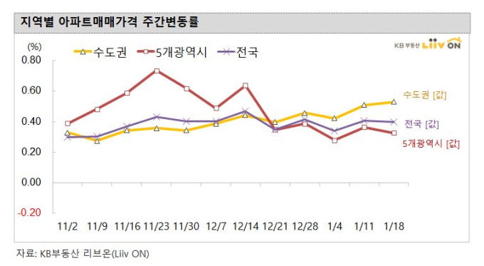 21일 KB부동산의 주간 주택시장 동향을 보면 이번주(18일 기준) 수도권의 아파트 매매가격 상승률은 전주(0.51%) 보다 상승한 0.53%를 기록했다.