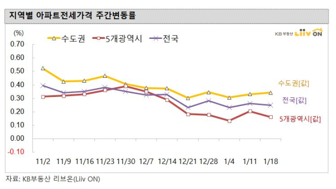수도권 가운데 서울(0.30%→0.32%)과 인천(0.16%→0.30%)의 전셋값 상승률은 올라갔으며, 경기(0.39%→0.37%)는 다소 하락했다.