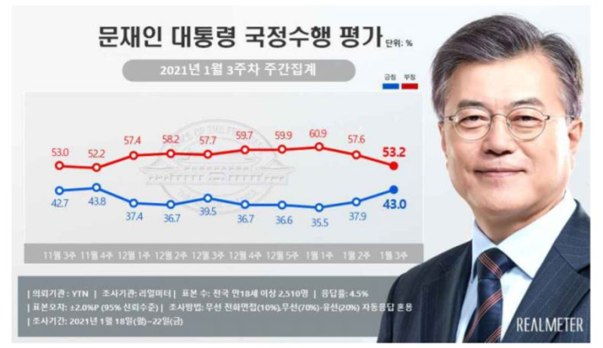 여론조사 전문기관 리얼미터(대표 이택수)가 YTN 의뢰로 18일부터 22일까지 닷새 동안 전국 18세 이상 유권자 5만5217명에게 통화를 시도해 최종 2,510명(무선 80 : 유선 20)이 응답을 완료한 2021년 1월 3주 차 주간 집계 결과 문재인 대통령 취임 194주 차 국정 수행 지지율(긍정평가)이 지난주 1월 2주 차 주간 집계 대비 5.1%P 오른 43.0%(매우 잘함 23.7%, 잘하는 편 19.4%)로 나타났다고 밝혔다.부정평가는 53.2%(잘못하는 편 15.3%, 매우 잘못함 37.9%)로 4.4%P 내렸다. '모름/무응답'은 0.7%P 감소한 3.7%를 보였다. 긍정평가와 부정평가의 차이는 10.2%P로 오차범위 밖이다.