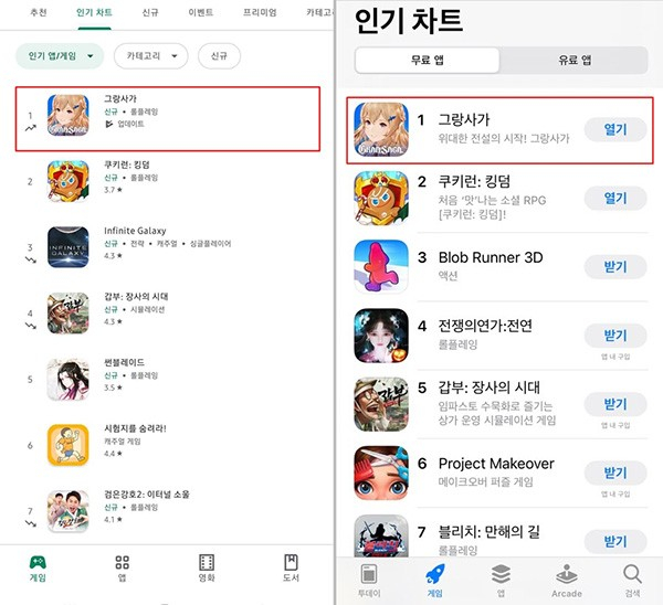 [쿠키뉴스] 문대찬 기자 =사전 등록자 500만 명을 돌파하며 흥행 예고했던 엔픽셀의 ‘그랑사가’가 26일 출시 이후 하루 만에 양대 마켓 인기 1위에 올라갔다.