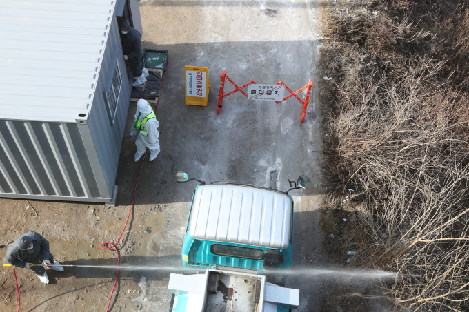 경기 파주시 조류 인플루엔자(AI) 확진 농장에서 방역 당국이 출입 차량을 소독하고 있다. 연합뉴스