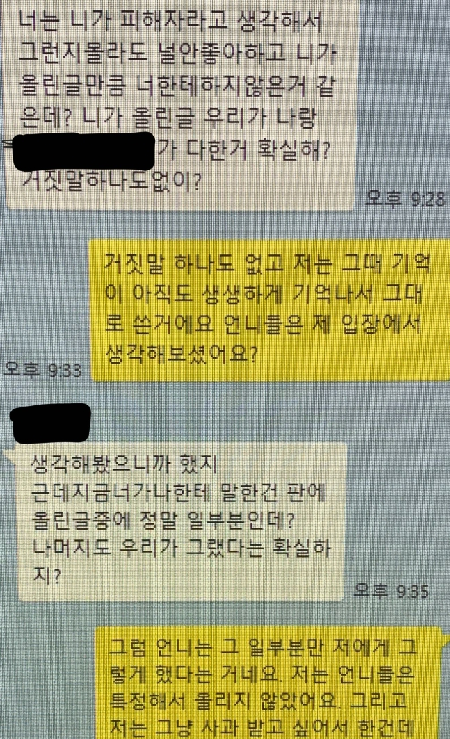 이에 피해자는 “거짓말 하나도 없고 그때 기억이 아직도 생생하게 기억나서 그대로 쓴거에요”라고 답하자, A씨는 다시 “네가 나한테 말한 건 판에 올린 글 중에 정말 일부분인데? 나머지도 우리가 그랬다는 확실하지?”라고 되물었다.