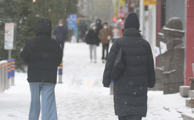 [쿠키뉴스] 박효상 기자 = 제주에 폭설이 쏟아진 18일 오전 제주시 연동의 거리에서 시민들이 출근하고 있다.