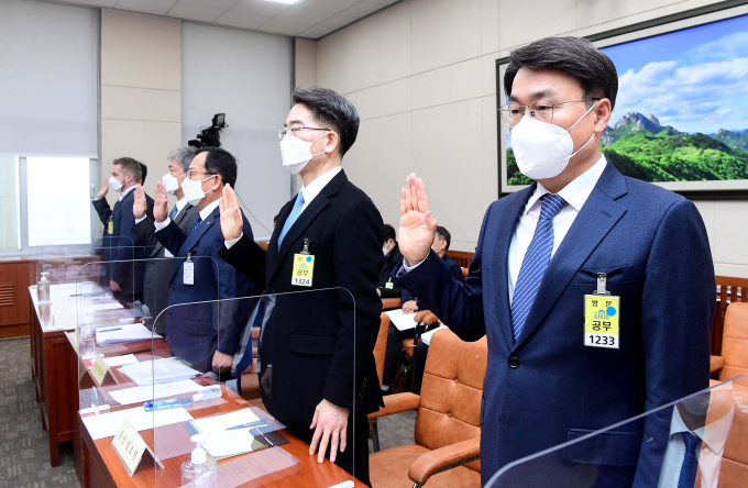 [쿠키뉴스] 박태현 기자 = 22일 서울 여의도 국회에서 열린 환경노동위원회 산업재해관련 청문회에서 최정우 포스코 회장(오른쪽) 등 증인들이 선서를 하고 있다.