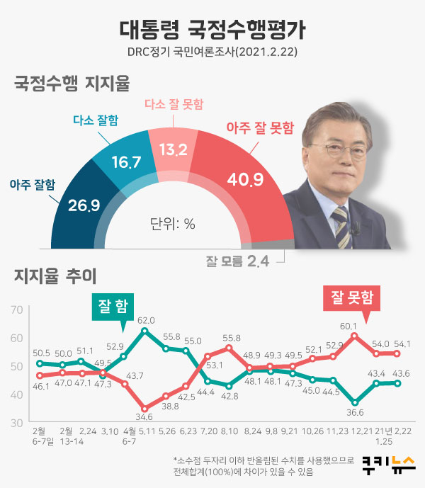 쿠키뉴스 의뢰로 여론조사전문기관 데이터리서치가 지난 22일 전국 만18세 이상 남녀 1000명에게 ‘문재인 대통령의 국정수행 지지율’을 조사한 결과 긍정평가는 지난주보다 0.2% 오른 43.6%(아주 잘함 26.9%, 다소 잘함 16.7%)로 나타났다. 반면 부정평가는 54.1%를 기록했고 잘 모르겠다는 응답은 2.4%였다.