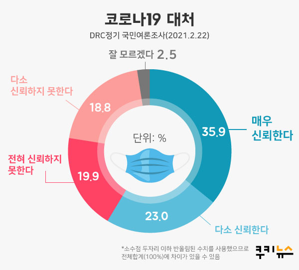 한편 국민 중 절반 이상은 우리 정부의 코로나19 방역 관련 대처에 신뢰감을 표시한 것으로 조사됐다. 설문조사 결과 국민 중 58.9%가 정부의 코로나19 정책에 긍정적인 반응을 나타냈다. 이는 부정 평가인 38.7%를 크게 웃도는 수치다. 결국 백신과 예산 등 여러 논란 속에서도 국민들은 정부가 코로나19에 따른 리스크를 잘 관리하고 있다고 평가하고 있는 것으로 드러났다.
