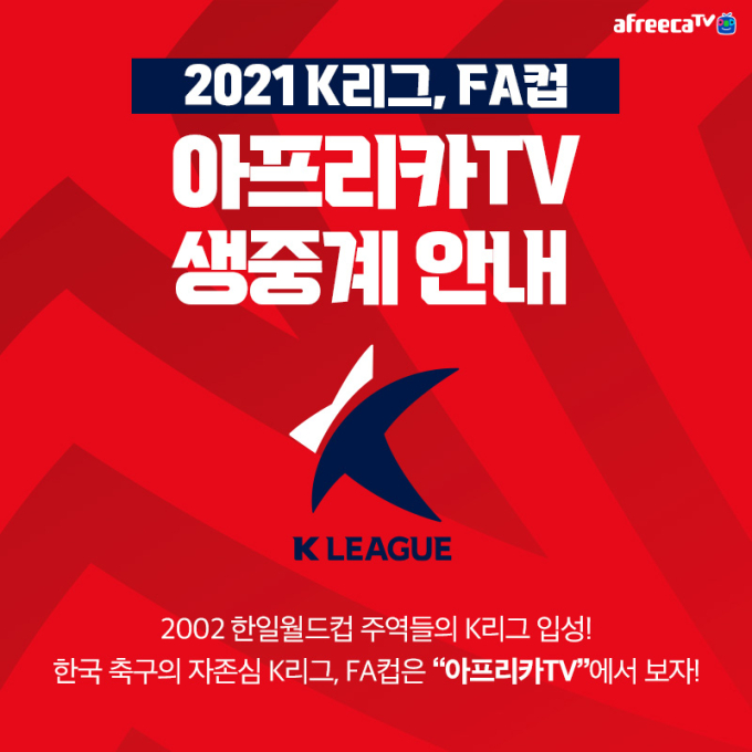 [쿠키뉴스] 문대찬 기자 =아프리카TV가 2021년에도 국내 프로 축구 ‘K리그, FA컵’ 생중계를 이어간다.