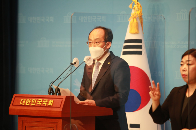 국회 예산결산특별위원회 국민의힘 간사인 추경호 의원은 5일 국회 소통관에서 기자회견을 열고 “선거를 위해 빚잔치를 하고 있다”며 “코로나로 힘들어하는 국민들에게 증세 청구서를 내미는 무책임하고 몰염치한 추경안”이라고 비판했다.