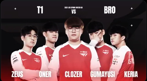 이날 T1은 젊은 피로 라인업을 꾸렸다. ‘오너’ 문현준, ‘구마유시’ 이민형, 류민석(이상 2002년생), ‘클로저’ 이주현(2003년생), ‘제우스’ 최우제(2004년생)가 선발로 출전했다.