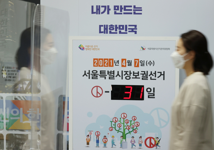 [쿠키뉴스] 박태현 기자 =7일 서울 종로구 서울시선거관리위원회 앞에 설치된 서울시장 보궐선거 현황판이 D-31을 가리키고 있다.