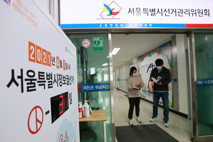 [쿠키뉴스] 박태현 기자 = 7일 서울 종로구 서울시선거관리위원회 앞에 설치된 서울시장 보궐선거 현황판이 D-31을 가리키고 있다.