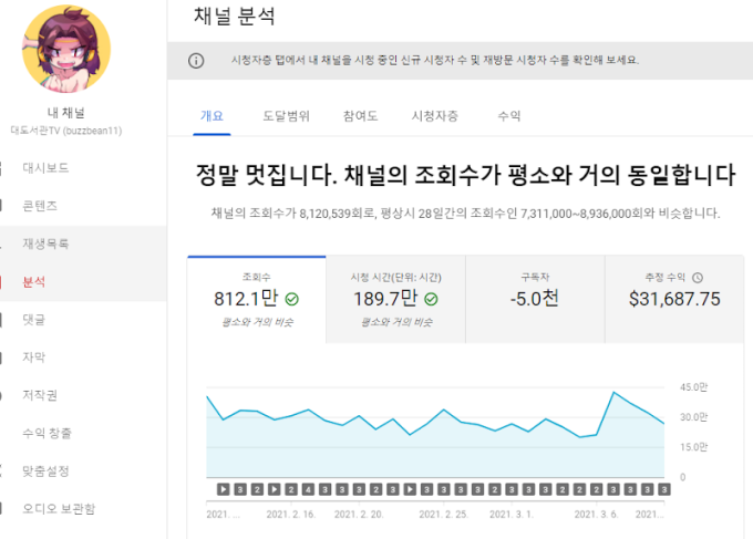 대도서관은 12일 자신의 유튜브 채널에 "요근래 남 먹고사는 거 걱정하시는 분들이 너무 많다. 그런데 걱정을 넘어서 도를 넘는 비아냥에 막말들이 들려서 이런 것까지 증명을 해야하다니 좀 슬프다"며 수익표를 게재했다.
