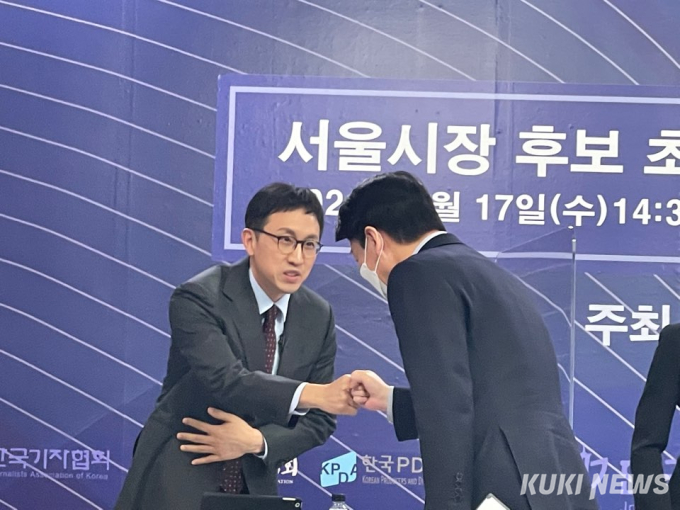 사회자였던 김현정 CBS라디오 PD가 가장 먼저 도착했다. 이후 패널로 참석한 기자와 PD가 차례로 자리에 앉았다. 주인공인 안 후보는 토론회 시작 약 10분 전에 도착했다. 미소를 가득 머금고 기자회견장에 도착한 그는 패널들과 주먹악수를 나눴다. 안 후보가 실수로 김 PD를 보지 못한 채 자리로 향했지만 이내 곧 웃으며 다시 인사했다.