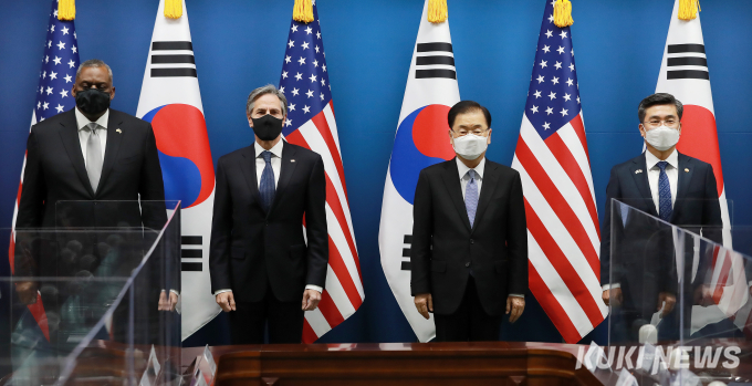 [쿠키뉴스] 박효상 기자 = 정의용 외교부 장관과 서욱 국방부 장관이 18일 오전 서울 종로구 외교부 청사에서 열린 한미 외교·국방장관회의에 앞서 토니 블링컨 미 국무장관, 로이드 오스틴 국방장관과 함께 기념촬영을 하고 있다.