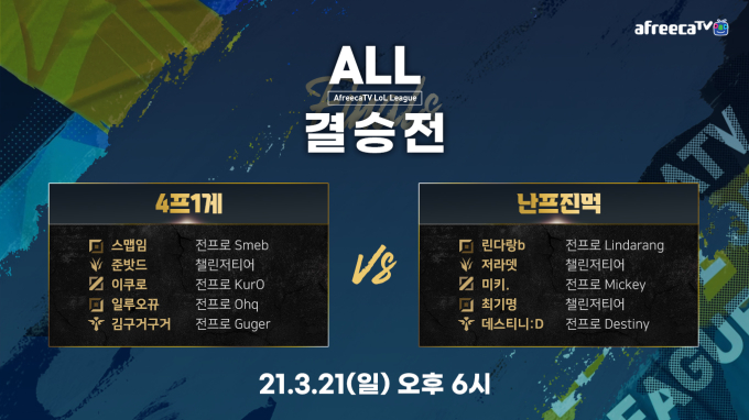 오후 6시부터 진행되는 결승전 경기에는 ‘스맵’이 이끄는 ‘4프1게(4 전 프로게이머, 1 게이머)’와 저라뎃이 이끄는 ‘난프진먹(난 프로에서도 진짜 먹혀)’이 맞붙는다. ‘4프1게’는 탑, 정글, 미드 포지션이 매우 강력한 팀이다. ‘난프진먹’은 현재 아프리카TV 내 최고의 아마추어 원거리 딜러로 꼽히는 최기명과 더불어 정글러 저라뎃의 활약이 인상적인 팀이다.