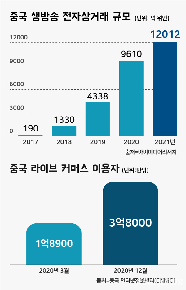 2019년부터 두각을 보인 중국 라이브 커머스 시장은 코로나바이러스 감염증-19(코로나19)의 대확산을 틈타 가파르게 성장했다. 초기에는 화장품·패션의류 등 소비재가 판매 대상이었지만 최근에는 자동차, 명품, 부동산 등도 속속 판매 상품에 이름을 올리고 있다. 중국 인터넷정보센터(CNNIC)에 따르면, 2020년 12월 기준 중국의 라이브 커머스 이용자는 3억8000만 명으로 2020년 3월보다 1억9100만 명 증가했다. 아이미디어리서치는 중국 생방송 전자상거래 시장 규모가 2020년 9610억(한화 약 167조 2043억원) 위안에서 2021년 1조2012억(208조 9967억원) 위안까지 성장할 것이라고 전망했다.