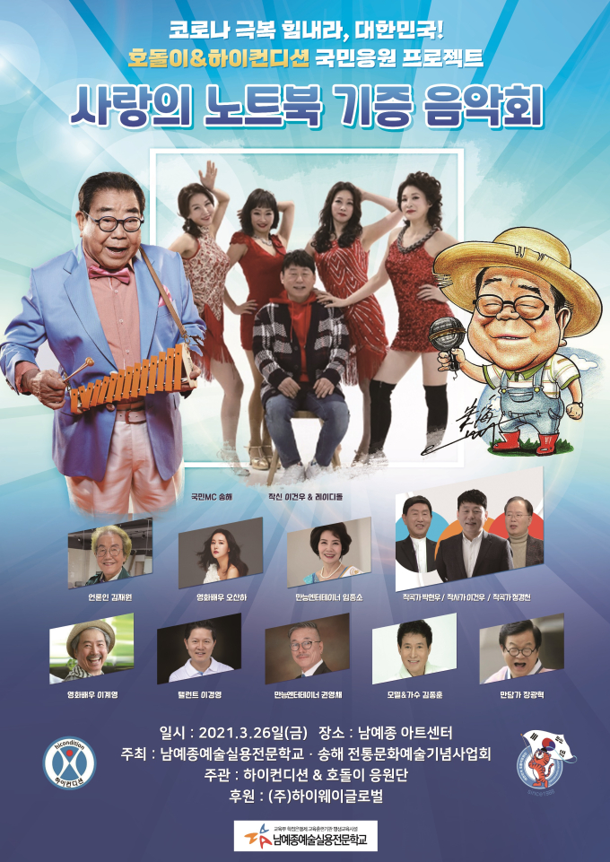 이번 ‘힘내라 힘!’ 사랑의 노트북 기증음악회는 남예종예술실용전문학교와 송해 전통문화예술기념사업회가 주최하고 하이컨디션 국민운동 본부와 국가대표 호돌이 응원단이 주관하며 ‘꿈·희망·행복·나눔’이란 주제로 오는 26일 남예종 아트센타에서 개최된다.