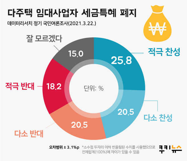 쿠키뉴스 의뢰로 여론조사기관 데이터리서치(DRC)가 지난 22일 전국 만 18세 이상 남‧여 1000명을 대상으로 다주택임대사업자에 관한 인식을 조사한 결과 응답자의 46.8%가 다주택 임대사업자 세금 특혜 폐지에 찬성했다.