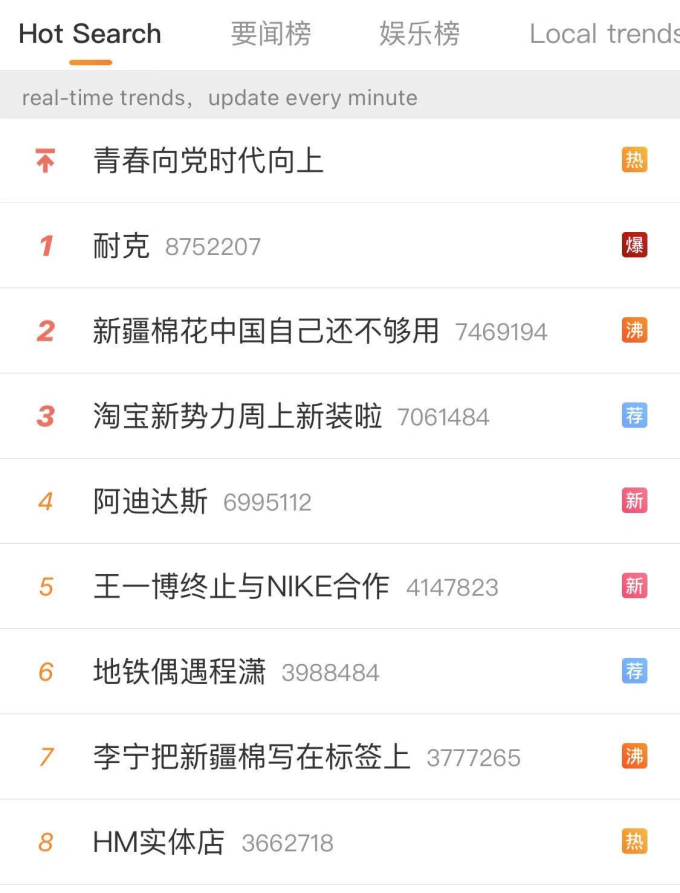 중국 내에선 현재 글로벌 패션 브랜드에 대한 불매 운동이 거세게 일고 있다. 나이키와 H&M을 비롯한 일부 기업이 중국 서부 신장(新疆)위구르 자치구의 강제 노동에 우려를 표하며 신장에서 생산한 면화를 사용하지 않겠다고 선언한 것이 발단이 됐다.