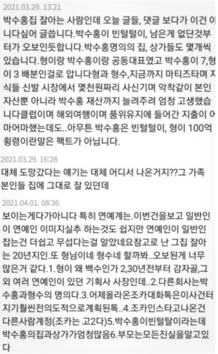 박수홍 형제의 지인이라고 밝힌 누리꾼 A씨는 "박수홍이 빈털터리, 남은 게 없단 것부터 오보인 듯하다"며 "박수홍 명의의 집, 상가들도 몇 개씩 있다. 형과 형수가 지금까지 경차 타고 자식들 신발을 시장에서 몇천 원짜리 사 신기며 악착같이 본인 자산뿐 아니라 박수홍 재산까지 늘려주려고 엄청 고생했다"고 적었다.