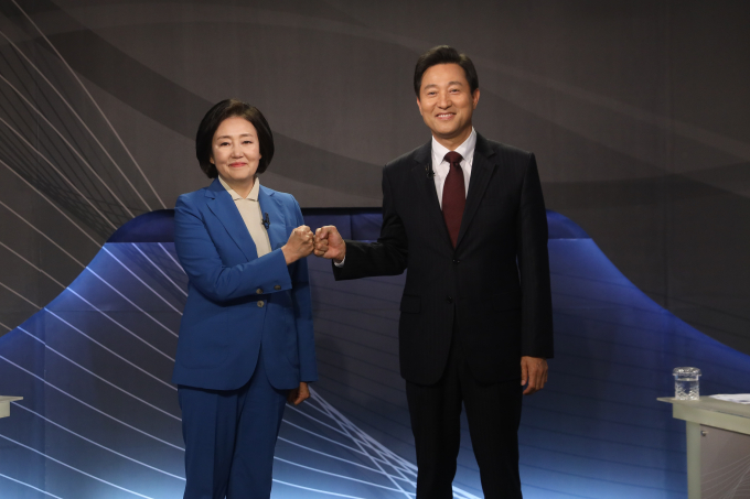 반면 오 후보도 지지 않았다. 그는 박 후보를 향해 ‘거짓말의 본체’라고 비난했다. 오 후보는 “나는 거꾸로 박 후보가 거짓말의 본체라고 생각하고 있다. 박 후보의 존재 자체가 거짓말 아니냐”고 반문한 뒤 “민주당이 (이번 선거에) 후보를 안 내기로 했다. 그런데 규정까지 바꿔서 (선거에) 나왔다. 거짓말을 했다”고 목소리를 높였다.
