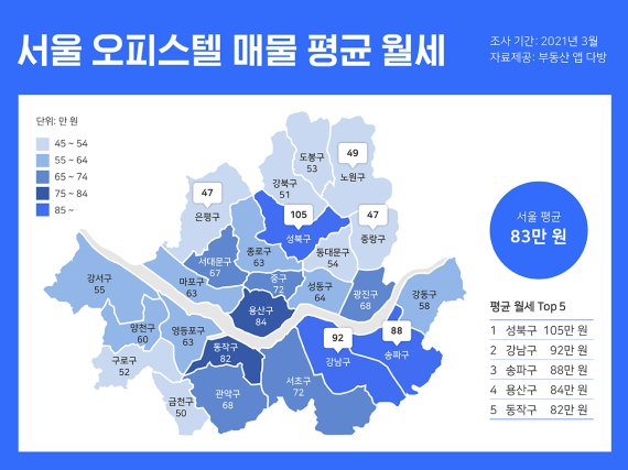 지역구별로 살펴보면 성북구 오피스텔의 월세가 가장 많이 상승했다. 성북구 월세 평균은 105만원으로, 1년 전(81만 원)과 비교해 29.6% 상승했다.