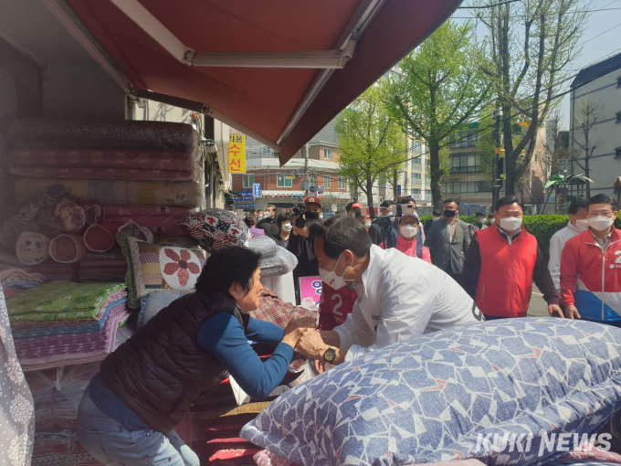 [수유=쿠키뉴스 최기창 기자] 오세훈 국민의힘 서울시장 후보가 강북구 수유동에서 시민들을 만나 지지를 호소했다. 아울러 노후된 강북구청에 대한 설명을 듣기도 했다.