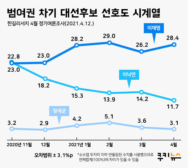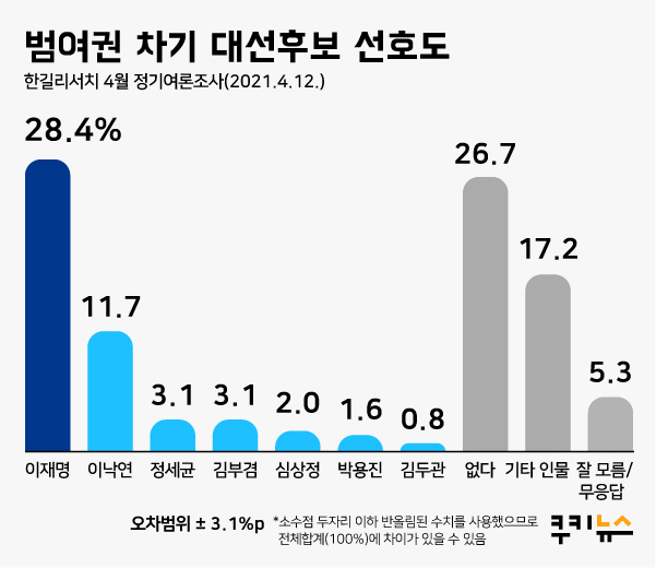 쿠키뉴스 의뢰로 여론조사기관 한길리서치가 지난 10일부터 12일까지 사흘 동안 전국 만 18세 이상 유권자 1000명을 대상으로 ‘범여권 차기 대선주자 선호도’를 조사한 결과 이 도지사가 28.4%로 선두를 차지했다. 이낙연 전 민주당 대표는 11.7%로 2위에 머물렀다. 정세균 총리와 김부겸 전 행정안전부 장관 등은 3.1%로 뒤를 이었다.