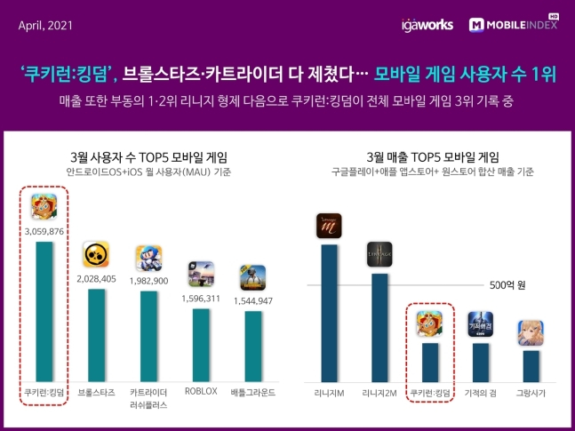 쿠키런 킹덤은 3월 월간 사용자수(MAU)가 가장 많은 모바일 게임이었다. 305만9876명으로 가장 많았고 브롤스타즈가 202만8405명, 카트라이더 러쉬플러스가 198만2900명, 로블록스(ROBLOX)가 159만6311명, 배틀그라운드가 154만4947명으로 뒤를 이었다.
