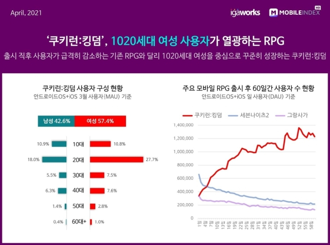 쿠키런 킹덤은 ‘1020세대 여성’에게 많은 사랑을 받고 있는 것으로 나타났다. 3월 사용자 중 여성이용자가 57.4%로 남성이용자 42.6%보다 높게 나타났다. 20대 여성이 27.7%로 가장 많았고, 10대 여성이 10.9%로 뒤를 이었다. 30~50대 남성 위주의 국내 모바일 게임시장에서 20대 여성 이용자 유입에 성공한 것이라 눈길을 끈다.