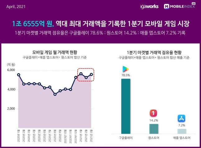 한편 리포트에 따르면 올해 1분기 국내 모바일게임 시장에선 총 1조6천555억원의 거래액이 오가며 분기 기준 역대 최고치를 기록한 것으로 알려졌다. 앱 마켓별 거래액 점유율은 구글플레이 78.6%, 원스토어 14.2%, 애플 앱스토어 7.2%순이었다.