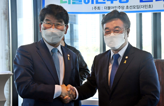 [쿠키뉴스] 최기창 기자 =더불어민주당 원내대표 경선에 도전장을 던진 윤호중‧박완주 의원이 초선의원들 앞에서 지지를 호소했다.