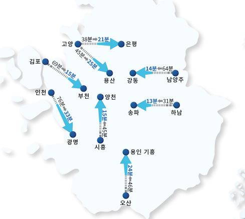 계획안에 포한된 수도권 노선은 총 8개로, 김포-부천(69분→15분)을 비롯해 인천-광명(76분→33분), 용인-오산(45분→24분) 등 경기·인천권 내 노선 3개와 고양-은평(38분→21분), 고양-용산(45분→25분), 남양주-강동(64분→14분), 하남-송파(31분-13분), 양천-시흥(45분→15분) 등 이다.