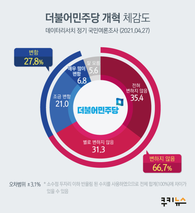 쿠키뉴스 의뢰로 여론조사기관 데이터리서치(DRC)가 지난 26일 전국 만 18세 이상 남‧여 1000명을 대상으로 4.7 보궐선거 결과에 관한 인식을 조사한 결과 응답자의 66.7%가 ‘선거 이후에도 더불어민주당이 변하지 않았다’고 답변했다.