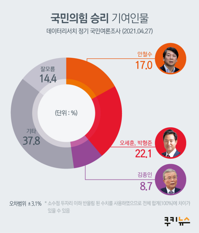 국민의힘의 승리 요인에 관한 질문에는 22.1%가 ‘오세훈‧박형준’을 꼽았다. ‘안철수 국민의당 대표’를 선택한 사람은 17.0%에 그쳤다. ‘김종인 전 국민의힘 비상대책위원장’을 선택한 답변은 8.7%에 머물렀다. 다만 ‘기타’와 ‘잘 모르겠다’는 답변이 각각 37.8%와 14.4%나 됐다.