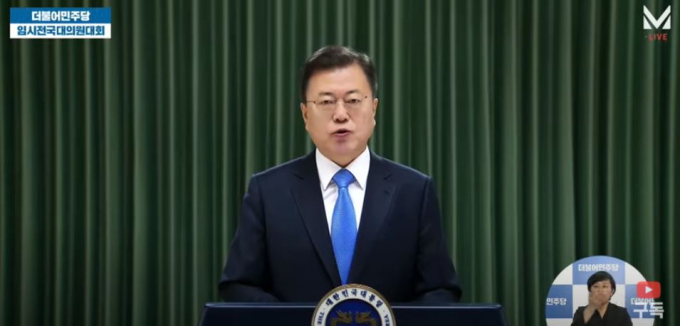 [쿠키뉴스] 최기창 기자 =4.7 보궐선거 패배 이후 지도부 개편이 이뤄지는 가운데 문재인 대통령이 전당대회 인사말을 통해 국민과 함께해야 한다고 강조했다.