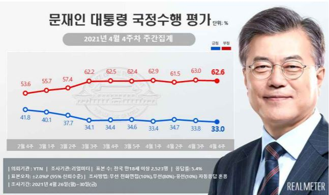 여론조사 전문기관 리얼미터(대표 이택수)가 YTN 의뢰로 지난달 26일부터 30일까지 닷새 동안 전국 18세 이상 유권자 4만6646명에게 통화를 시도해 최종 2523명(무선 90 : 유선 10)이 응답을 완료한 문 대통령 국정 수행 지지율 집계 결과 긍정평가가 33%로 나타났다.