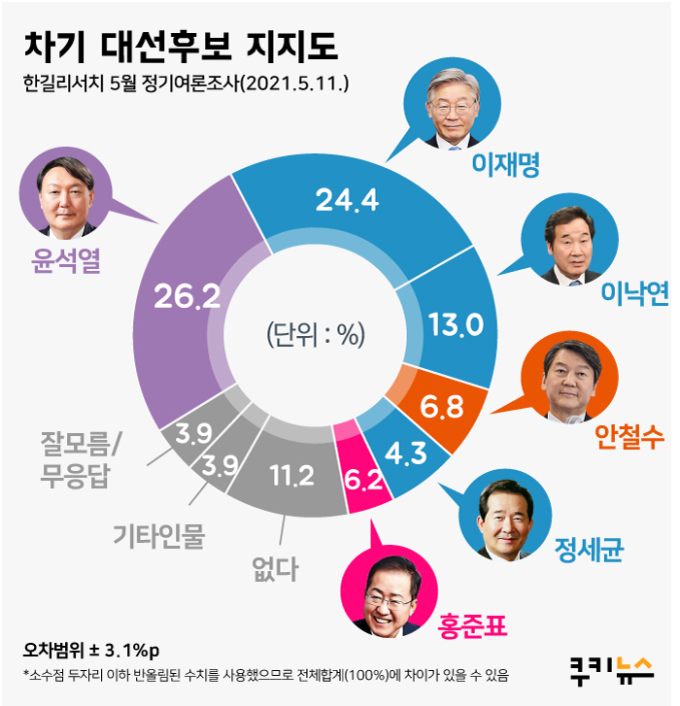 쿠키뉴스 의뢰로 여론조사기관 한길리서치가 지난 8일부터 11일까지 나흘 동안 전국 만 18세 이상 유권자 1010명을 대상으로 ‘차기 대선주자 선호도’를 조사한 결과 윤 전 총장과 이 도지사가 각각 26.2%와 24.4%로 오차 범위 안에서 접전을 펼쳤다.