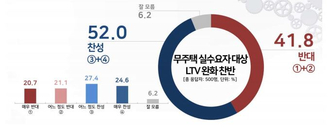 리얼미터가 지난 14일 전국 만 18세 이상 500명을 대상으로 조사한 결과, '무주택 실수요자에 대해 LTV 완화를 찬성한다'는 응답은 52.0%로 집계됐다. '반대한다'는 41.8%, '잘 모르겠다'는 6.2%였다.