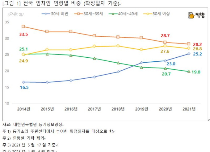 2018년부터는 모든 연령층의 임차인 비중이 늘어났다. 특히 30세 미만은 매년 10% 이상 증가하면서 임차인 증가를 주도했다. 다만 전문가들은 30세 미만 임차인 증가에 대해 보호장치가 필요하다는 게 중론이다. 사회경험 부족과 경제적 취약성 때문이다.
