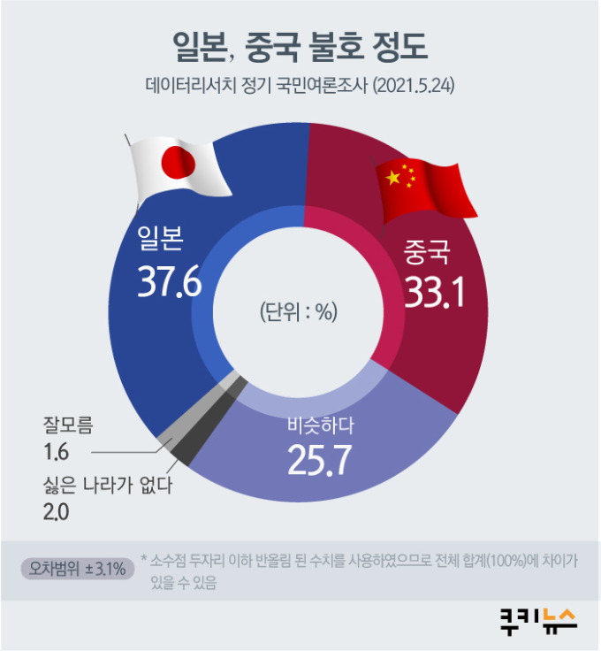 일본이 싫다는 응답은 37.6%였고 중국이 싫다는 응답도 33.1%나 됐다. 둘은 오차범위 안이다.