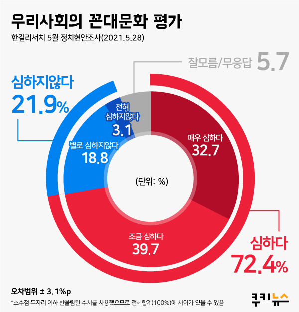 쿠키뉴스 의뢰로 여론조사기관 한길리서치가 지난 28일 전국 만 18세 이상 남‧여 1010명을 대상으로 ‘우리나라 꼰대 문화의 심각성’에 관한 인식을 조사한 결과 응답자의 72.4%가 심각하다고 응답했다.