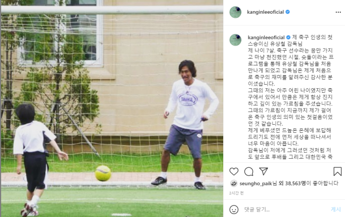 이강인은 인스타그램에 올린 글에서 “제 축구 인생 첫 스승이신 유상철 감독님”이라며 “나이 7살, 축구 선수라는 꿈만으로 마냥 천진했던 시절, 슛돌이라는 프로그램을 통해 감독님을 처음 만나게 됐고, 감독님은 제게 처음으로 축구의 재미를 알려주신 감사한 분이셨습니다”라고 말했다.