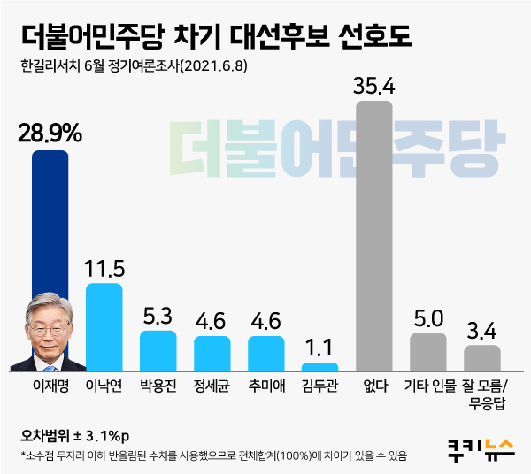 쿠키뉴스 의뢰로 여론조사기관 한길리서치가 지난 5~7일 전국 만 18세 이상 남‧여 1001명을 대상으로 ‘민주당 차기 대선주자 지지도’를 조사한 결과 응답자의 28.9%가 이 지사를 선택했다. 이낙연 전 당대표는 11.5%로 뒤를 이었다.