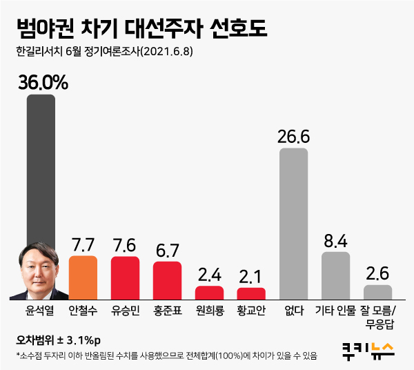 쿠키뉴스 의뢰로 여론조사기관 한길리서치가 지난 5~7일 전국 만 18세 이상 남‧여 1001명을 대상으로 ‘범야권 차기 대선주자 지지도’를 조사한 결과 응답자의 36%가 윤 전 총장을 선택했다.