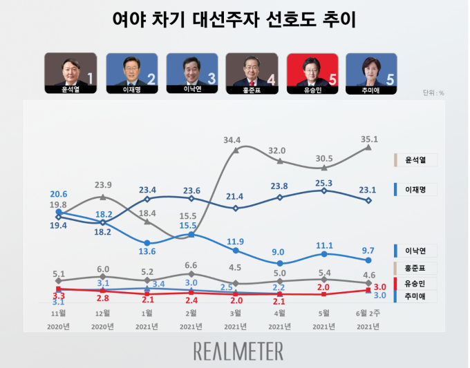 여론조사 전문기관 리얼미터가 오마이뉴스 의뢰로 여야 주요 정치인 14명을 대상으로 한 6월 2주 차기 대선주자 선호도 조사 결과 윤 전 총장이 35.1%로 선두를 차지했다. 이 지사는 25.1%로 2위였다. 둘의 차이는 오차범위 밖이다.