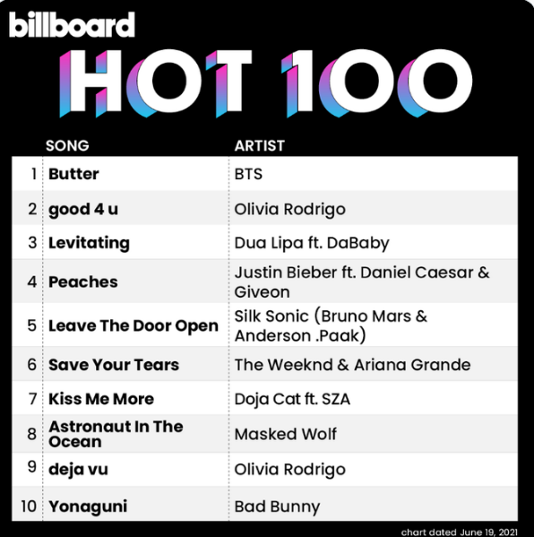 빌보드는 14일(현지시간) 버터가 메인 싱글차트 '핫 100'에서 1위를 기록했다고 밝혔다.