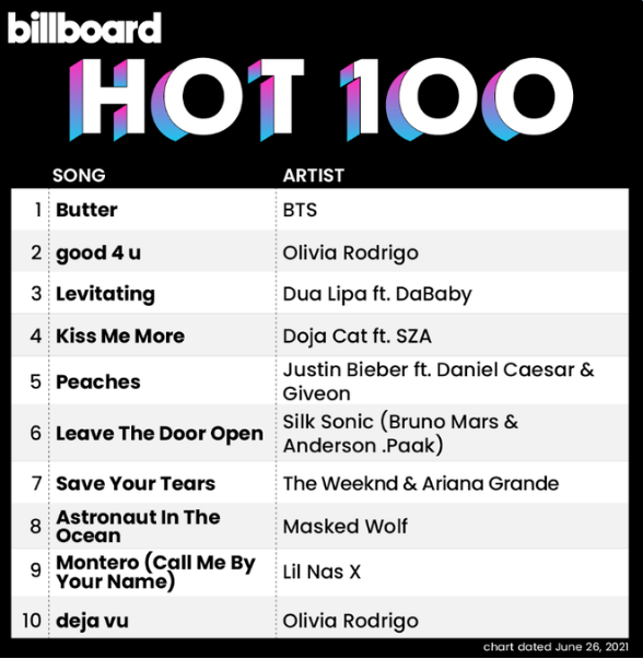그룹으로서는 1998년 9월 록밴드 에어로스미스 이후 처음이다. 올해 들어서는 8주 연속 1위를 기록한 올리비아 로드리고의 ‘드라이버스 라이선스’에 이어 두 번째다.