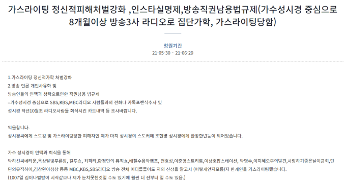 그는 지난달 30일 청와대 국민청원에 '가스라이팅 정신적피해처벌강화 ,인스타실명제,방송직권남용법규제(가수성시경 중심으로 8개월이상 방송3사 라디오로 집단가학, 가스라이팅당함)"라는 제목의 글을 올렸지만 이날 오후 3시54분 현재까지 51명의 동의를 얻은 상황이다.